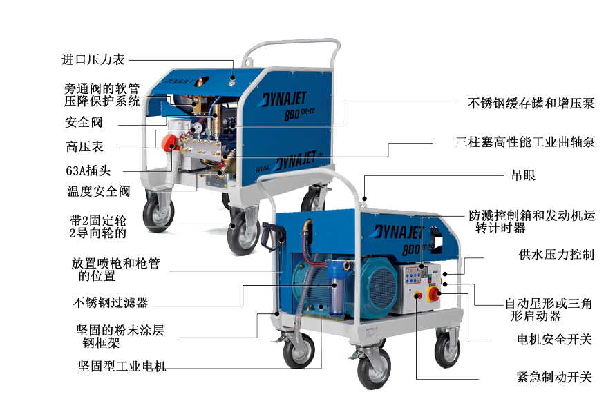 me”级的冷水高压清洁器的工作压力可达1000bar (14500psi),是DYNAJET先进的手推车设备之一。由于其高超的工艺和强大的电动马达这些手推车设备特别适合有效地清洗任务,如:清洗百叶结构、建筑机械或装置。它们也是理想的油漆去除或翻新工具。